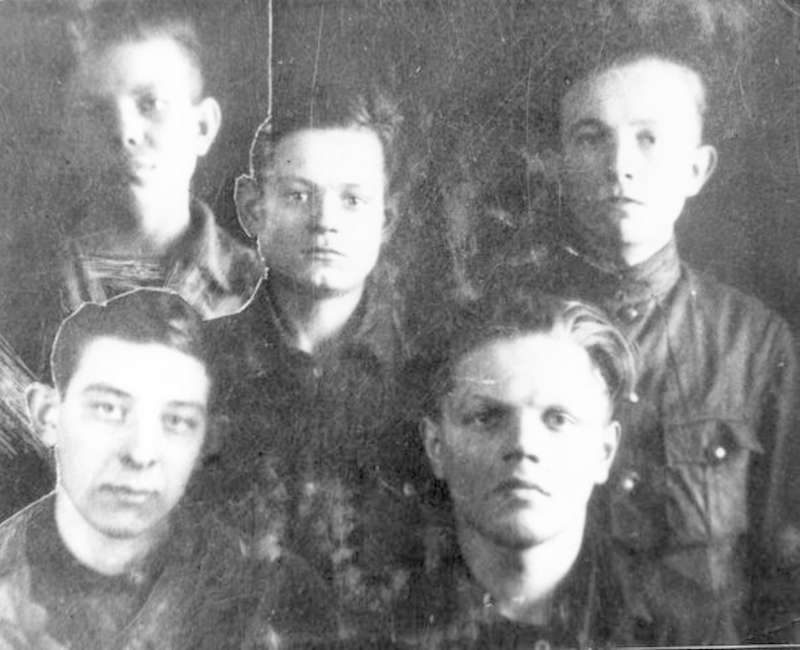 Коллекция документов Музея истории комсомола Удмуртии | Первая комсомольско-молодёжная фронтовая бригада Ижевского механического завода. 2 ряд (стоят): 2-й слева - Русских; 3-й - А. Бубнов, бригадир | ~1943 г. | позитив, фотобумага, удовлетворительное | |