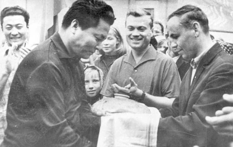 —//— | Комсомольцы и молодежь Балезинского района встречают делегацию Вьетнама, участников IX Всемирного фестиваля молодежи и студентов в г.София. Аркадий Кондратьев, I секретарь райкома ВЛКСМ, вручает хлеб и соль | 19 июля 1968 | позитив, фотобумага, удовлетворительное | |