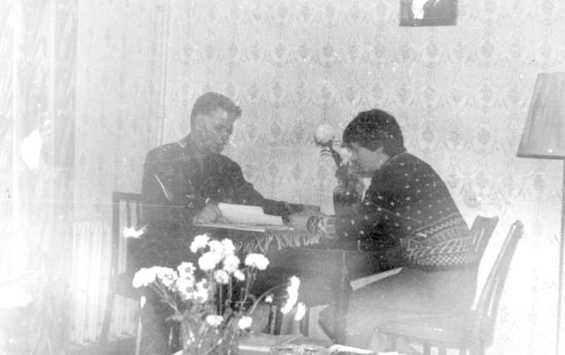 —//— | Герой Советского Союза Евдокимов Г.П. дома за рабочим столом в военной форме с орденами и медалями беседует с посетительницей. Копия | позитив, фотобумага, удовлетворительное | ||