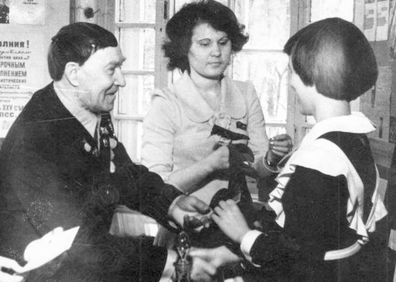 —//— | Делегация представителей школы слабовидящих детей, занявших I-е место во Всесоюзной экспозиции пионеров и школьников "Моя Родина- СССР". Слева- Рыжов Михаил Яковлевич, первый председатель Сарапульского окружного комитета ВЛКСМ, организатор комсомола г.Сарапула, узник баржи смерти | ~1979 г. | позитив, фотобумага, удовлетворительное | |