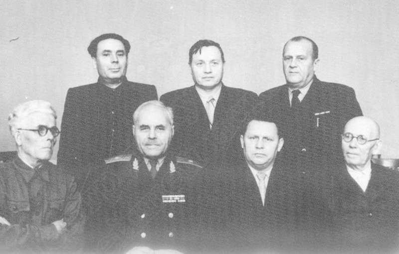 Коллекция документов Музея истории комсомола Удмуртии | Степан Парфенович Зубарев (верхний ряд в центре) среди бывших бойцов Азинской дивизии. Слева направо 1-й ряд: Комаров, Гундорин, Мерзляков, Дурнашихин | ~1970 г. | позитив, фотобумага, удовлетворительное | |