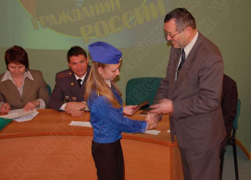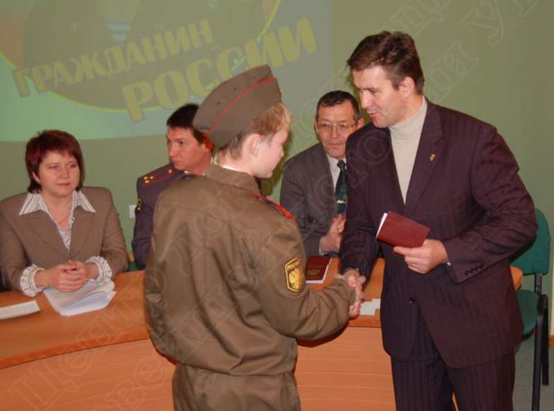 —//— | Республиканская акция "Я - гражданин России!" в Музейно-выставочном комплексе стрелкового оружия им. М.Т. Калашникова. Паспорт гражданина РФ вручает конструктор стрелкового оружия Драгунов Михаил Евгеньевич (справа) | 7 декабря 2007 | JPЕG, эл.фотодок, диск, хорошее |