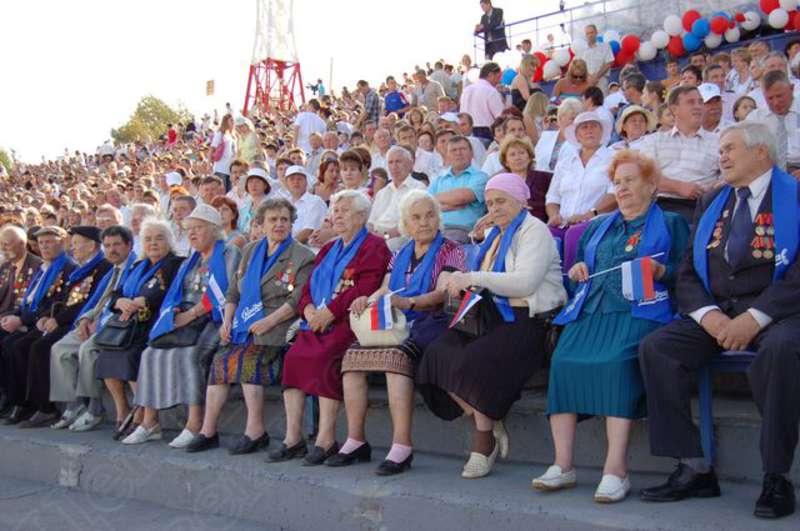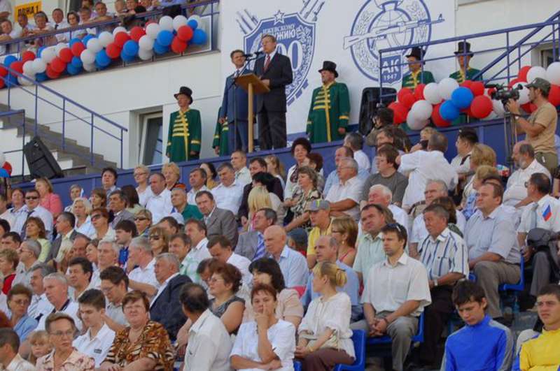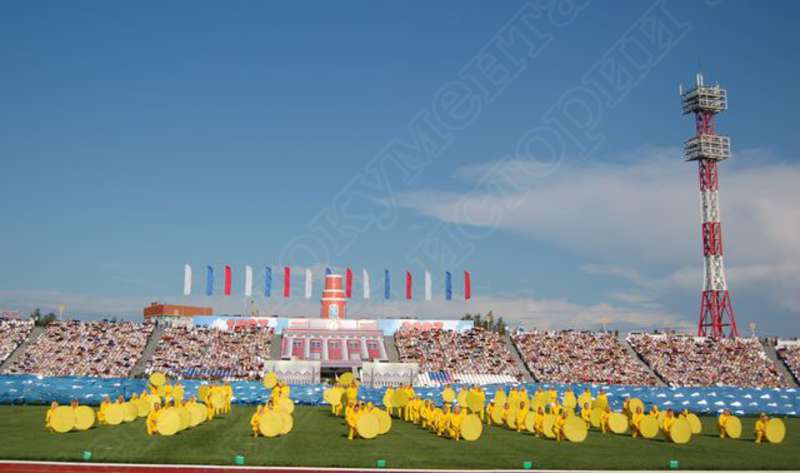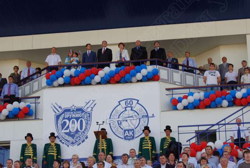 —//— | Театрализованное представление в честь празднования 200-летия Ижевского оружия и 60-летия автомата Калашникова на Центральном республиканском стадионе. Участники праздника на центральной трибуне (слева направо): 3-й - Президент УР Волков Александр Александрович, 4-й - министр финансов РФ Кудрин Алексей Леонидович, 5-я - председатель Фонда социального страхования РФ Карелова Галина Николаевна, 6-й - руководитель Федерального агентства культуры и кинематографии Швыдкой Михаил Ефимович | 7 августа 2007 | JPЕG, эл.фотодок, диск, хорошее |