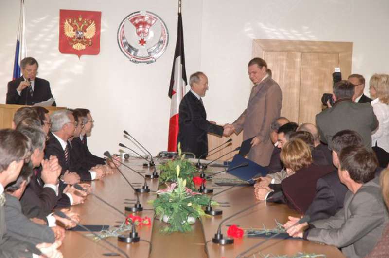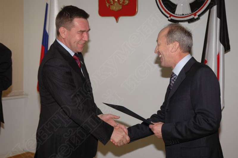 Коллекция фотодокументов | Церемония награждения победителей Всероссийского конкурса "100 лучших товаров России". Диплом победителя конкурса генеральному директору Открытого акционерного общества "Сарапульский ликероводочный завод" Бикбулатову Ильдару Ильшатовичу вручает Председатель Правительства УР Питкевич Юрий Степанович (слева направо) | 9 декабря 2005 | JPЕG, эл.фотодок, диск, хорошее |