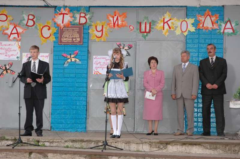 —//— | Торжественная линейка в средней общеобразовательной школе №38 г. Ижевска, посвященная Дню знаний. Участники линейки (справа налево): глава Администрации Ленинского района г. Ижевска Пиянзин Андрей Викторович, мэр города Ижевска Балакин Виктор Васильевич | 1 сентября 2005 | JPЕG, эл.фотодок, диск, хорошее |