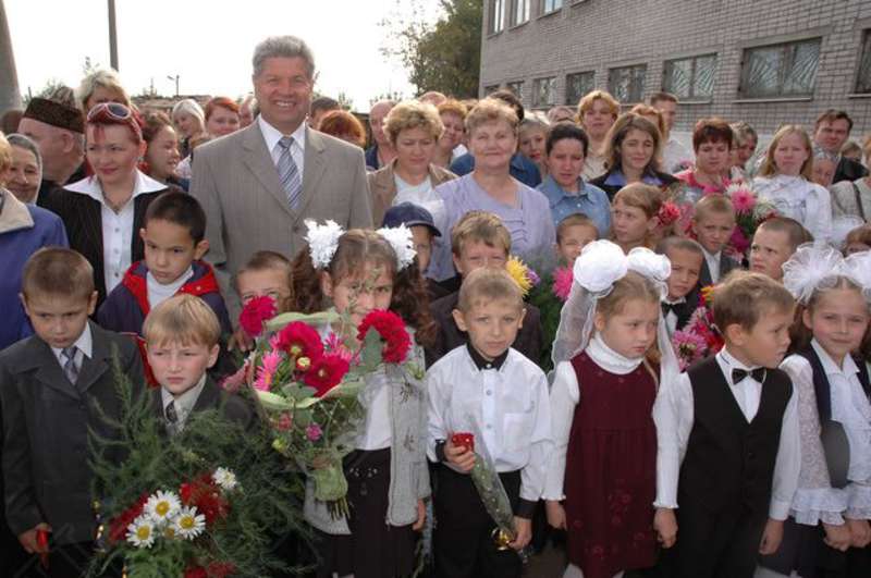 —//— | Торжественная линейка в средней общеобразовательной школе №38 г. Ижевска, посвященная Дню знаний. Мэр города Ижевска Балакин Виктор Васильевич с учениками и их родителями (в центре) | 1 сентября 2005 | JPЕG, эл.фотодок, диск, хорошее |