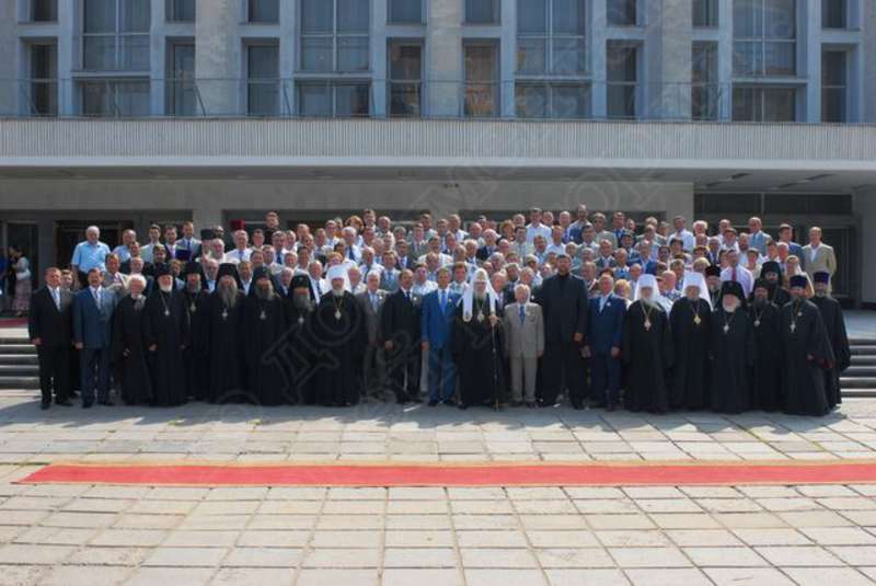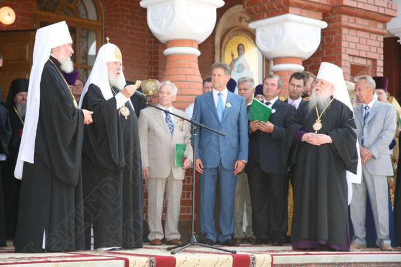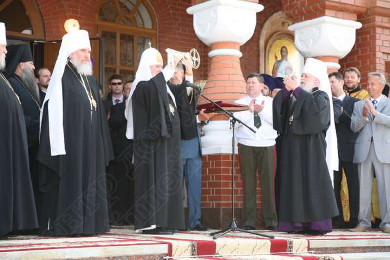 —//— | Церемония приветствий и награждений по случаю освящения Свято-Михайловского собора у главного входа в собор. Святейший Патриарх Московский и всея Руси Алексий II (в центре) с символическим ключом от собора | 5 августа 2007 | JPЕG, эл.фотодок, диск, хорошее |