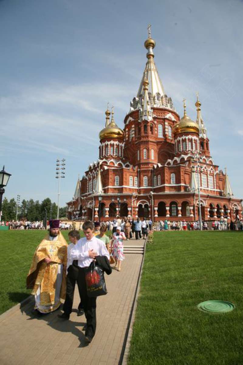 —//— | Церемония приветствий и награждений по случаю освящения Свято-Михайловского собора у главного входа в собор. Участники церемонии (слева направо): 2-й - Святейший Патриарх Московский и всея Руси Алексий II, 3-й - конструктор стрелкового оружия Калашников Михаил Тимофеевич, 4-й - Президент УР Волков Александр Александрович, 5-й - начальник Управления специального строительства по территории №8 при Спецстрое РФ Прасолов Алексей Михайлович, 6-й - Митрополит Ижевский и Удмуртский Николай | 5 августа 2007 | JPЕG, эл.фотодок, диск, хорошее |
