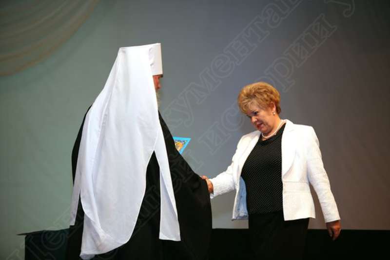 —//— | Вручение Патриаршей грамоты председателю Комитета по делам архивов при Правительстве УР Коробейниковой Надежде Кузьминичне (справа) на торжественном приеме по случаю освящения Свято-Михайловского собора | 5 августа 2007 | JPЕG, эл.фотодок, диск, хорошее | |