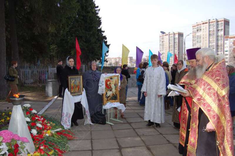 —//— | Митинг, посвященный празднику Победы в Великой Отечественной войне 1941-1945 гг. у Мемориала захоронения воинов, умерших от ран в госпиталях г. Ижевска. Поминальная служба у мемориала захоронения воинов, умерших от ран в госпиталях г. Ижевска, в центре (слева направо): отец Виктор (Сергеев), отец (Евгений), священнослужители церкви Святых царственных страстотерпцев. Снимок 2 | 8 мая 2007 | JPEG, эл.фотодок, диск, хорошее |