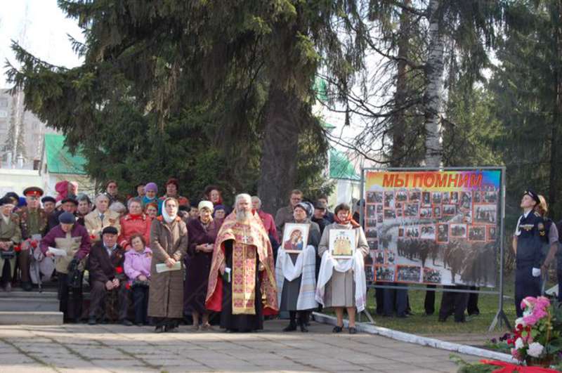 Коллекция фотодокументов | Митинг, посвященный празднику Победы в Великой Отечественной войне 1941-1945 гг. у Мемориала захоронения воинов, умерших от ран в госпиталях г. Ижевска. Поминальная служба у мемориала захоронения воинов, умерших от ран в госпиталях г. Ижевска, в центре (слева направо): отец Виктор (Сергеев), отец (Евгений), священнослужители церкви Святых царственных страстотерпцев. Снимок 1 | 8 мая 2007 | JPEG, эл.фотодок, диск, хорошее |