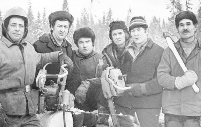 —//— | Бригада лесозаготовителей верхнего склада Верхне-Вятского участка Глазовского комбината промышленных предприятий (слева направо): вальщик леса Семушин Михаил, сучкоруб Колбасов Николай, бригадир Максимов Владимир, сучкорубы Наймушин Алексей, Будин Александр и Романов Василий | 9 февраля 1986 | позитив, фотобумага, удовлетворительное | ![]() |