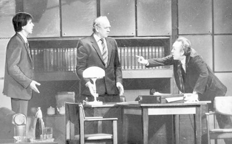 —//— | Сцена из спектакля Государственного русского драматического театра им. В.Г. Короленко "Последний посетитель". В ролях (слева направо): Ермаков - артист В. Воронцов, Казмин - заслуженный артист УАССР П. Рекец, Посетитель - заслуженный артист УАССР В. Свечников | 9 февраля 1986 | позитив, фотобумага, удовлетворительное | ![]() |