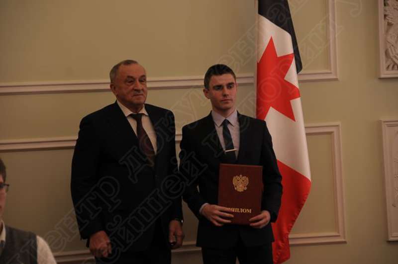 —//— | Александр Васильевич Соловьёв, Глава УР вместе с одним из победителей олимпиад и конкурсов на традиционной ежегодной церемонии вручения дипломов талантливой молодёжи в резиденции Главы УР в рамках национального проекта "Образование". Снимок 1 | 15 февраля 2016 | Jpeg, эл. ф/док, диск, хорошее | |