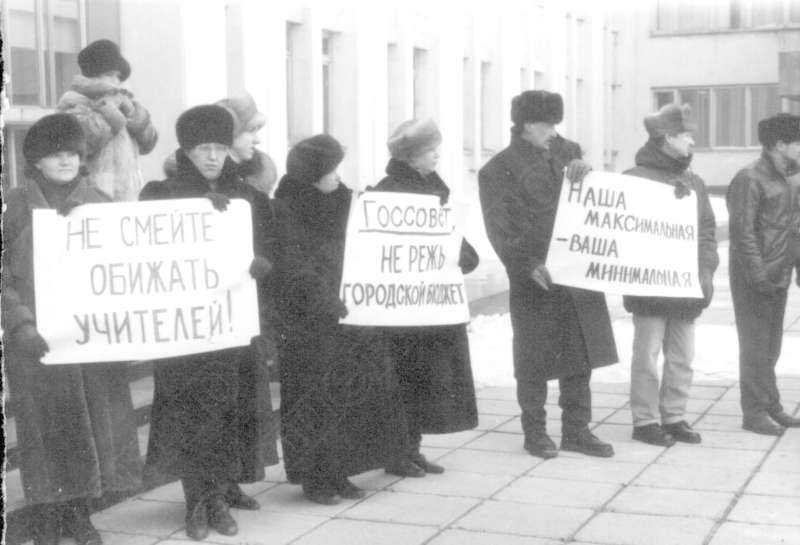 —//— | Пикетирование Государственного Совета УР учителями школ г.Ижевска. Групповой снимок. Учителя школы №7. Слева направо: Данилова Татьяна Николаевна, Гайнутдинова Светлана Геннадьевна, Торхова Наталья Федоровна, Абросимова Ольга Николаевна, Потапова Елена Васильевна, Шкляев Сергей Николаевич | 17 марта 1998 | 24 х 36 мм, негатив, пленка, удовлет. | |