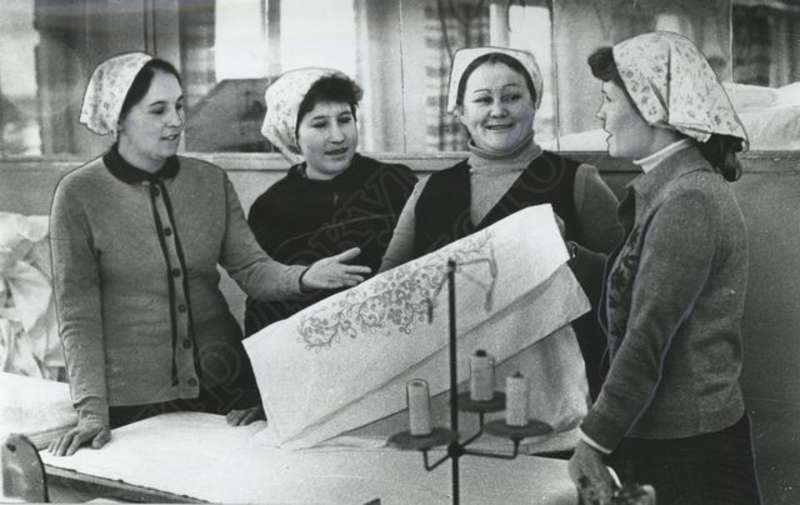 Коллекция фотодокументов | Швеи-мотористки Устиновской фабрики художественных товаров (слева направо): Г.А. Курсакова, А.Ф. Зубарева, наставник, ударник коммунистического труда Китаева Зоя Васильевна, Е.И. Иванова | 18 января 1985 | позитив, фотобумага, удовлетворительное | ![]() |