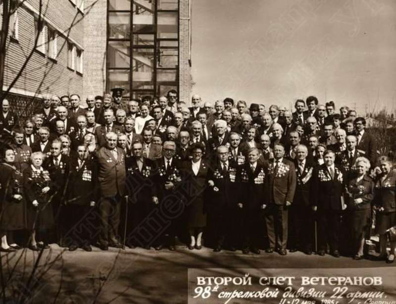 —//— | Второй слет ветеранов 98-й стрелковой дивизии. . Первый ряд, слева направо: 2-я - Носикова В.С., 7-й - Пономарев Иван Васильевич, 10-й - Анисенков Н.А., 13-й - Зубарев Степан Парфенович. | 11 мая 1985 | позитив, фотобумага, удовлетворительное |