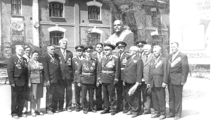 —//— | Ветераны 220-й Оршанской стрелковой дивизии у памятника В.И. Ленину. г.Елец. Слева направо: 1-й - Беляев Борис Александрович, секретарь Совета ветеранов дивизии, кавалер 3-х орденов Красной Звезды; 5-й - Н.В. Ольховский; 8-й - Пащенко Василий Моисеевич; 9-й - В.Г. Сошнев, генерал-майор, председатель Совета ветеранов дивизии | 9 мая 1981 | позитив, фотобумага, удовлетворительное |