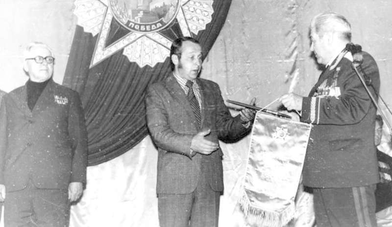 —//— | Торжественное заседание, посвящённое 36-й годовщине победы в Великой Отечественной войне. г.Елец. В.Г. Сошнев, генерал-майор, председатель Совета ветеранов 220-й Оршанской стрелковой дивизии (1-й справа) вручает почетную грамоту и вымпел Совета ветеранов дивизии представителю средней школы г.Одесса (2-й справа) | 9 мая 1981 | позитив, фотобумага, удовлетворительное | |