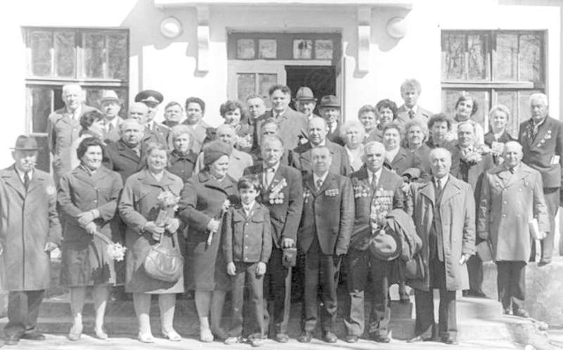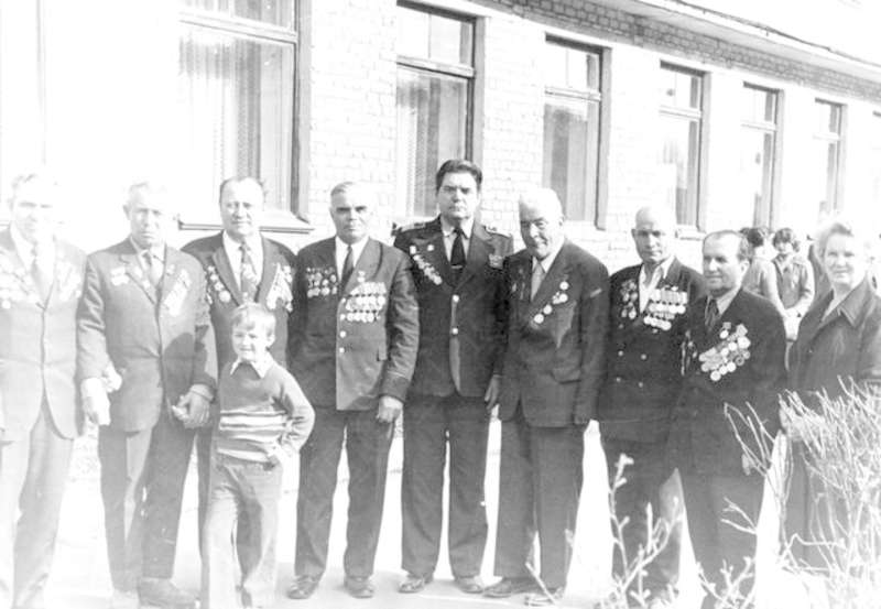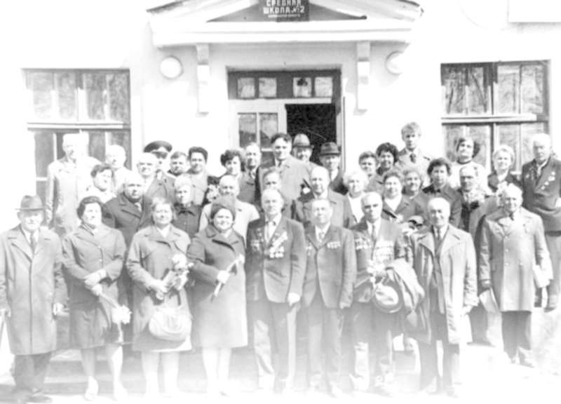 —//— | Ветераны 220-й Оршанской стрелковой дивизии у здания средней школы №2 г.Ржева. 1 ряд: 2-й справа - И.Г. Кулемин; 4-й - Беляев Борис Александрович, секретарь Совета ветеранов дивизии; 2 ряд: 2-й слева - Д.Д. Кулаков. Снимок 1 | 9 мая 1980 | позитив, фотобумага, удовлетворительное | |