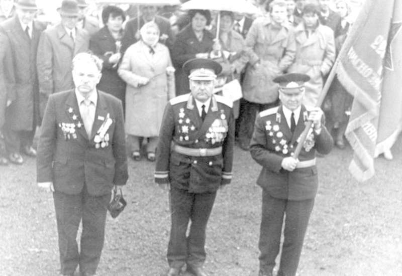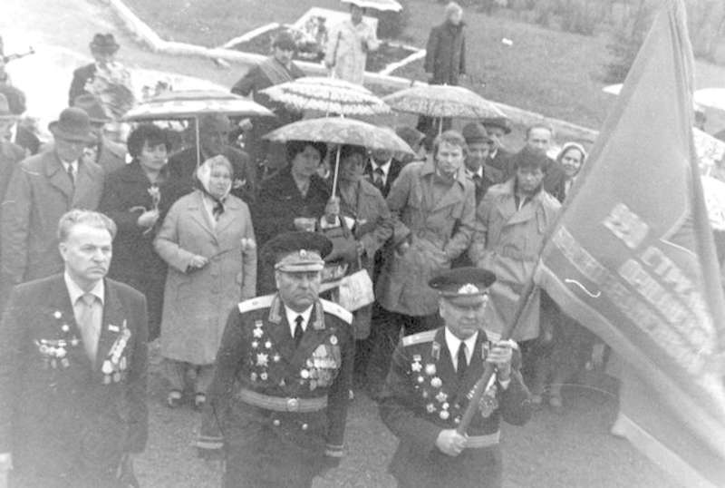 —//— | Ветераны 220-й Оршанской стрелковой дивизии и жители г.Ржева на митинге в честь 35-й годовщины победы в Великой Отечественной войне. На переднем плане слева направо: Беляев Борис Александрович, секретарь Совета ветеранов дивизии; В.Г. Сошнев, генерал-майор, председатель Совета ветеранов дивизии; Сковородкин Георгий Викторович, в годы войны командир 653 полка, полковник, кавалер орденов А.Суворова, А. Невского, 2-х Красного Знамени, Красной Звезды. Снимок 1 | 9 мая 1980 | позитив, фотобумага, удовлетворительное | |