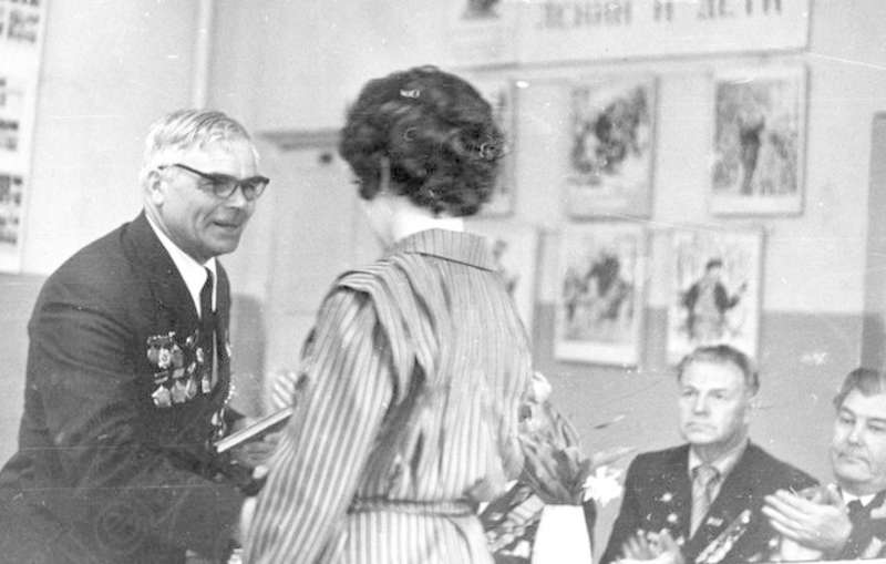 —//— | Торжественная встреча ветеранов 220-й Оршанской стрелковой дивизии со школьниками средней школы №2 г.Ржева. И.Г. Кулемин дарит свою книгу "Героев наших имена" директору музея школы №2 | 9 мая 1980 | позитив, фотобумага, удовлетворительное | |
