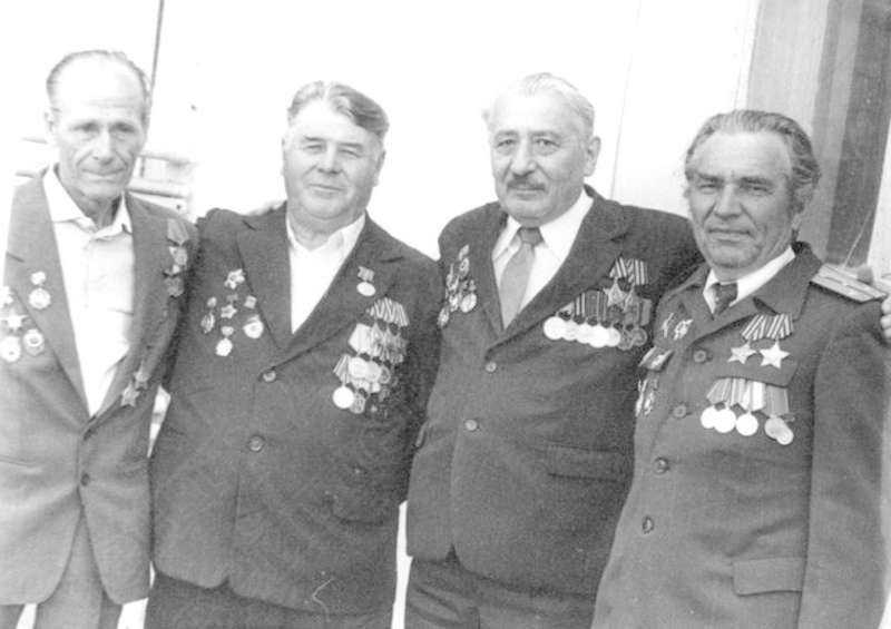 —//— | Ветераны 52-й отдельной разведывательной роты 51-й гвардейской стрелковой дивизии во время встречи в г.Куйбышеве. Слева направо: Крылов Константин Михайлович; [Исаев Николай Васильевич]; Санто Виктор Павлович; Васильев Евгений Дмитриевич. Снимок 2 | 14 июня 1986 | позитив, фотобумага, удовлетворительное |