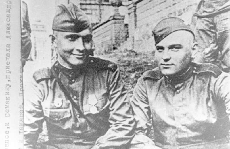 —//— | Военнослужащие 2-го стрелкового батальона 269-го гвардейского стрелкового полка 88-й стрелковой дивизии в Германии. Животовский Алексей Федорович (слева), сержант; Щеглов Евгений (справа), рядовой. Копия. Имеется аннотация | ~апрель 1945 г. | позитив, фотобумага, удовлетворительное | |