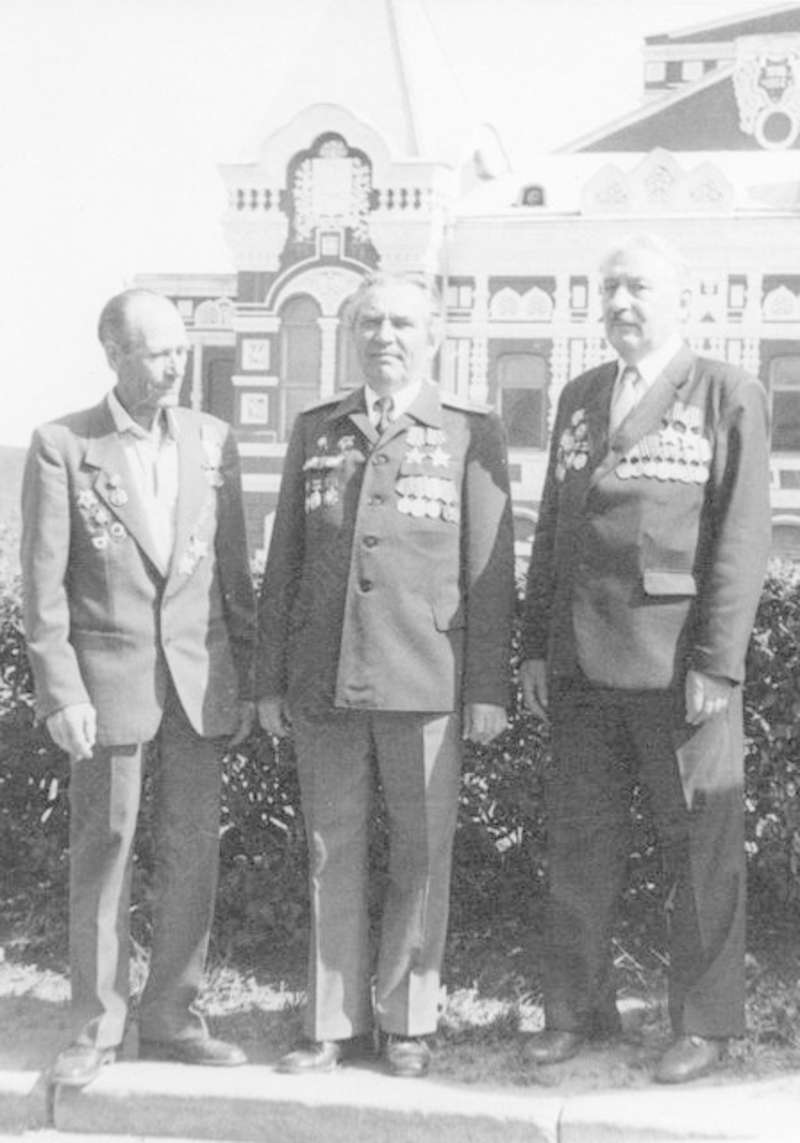 —//— | Ветераны 52-й отдельной разведывательной роты 51-й гвардейской стрелковой дивизии у здания Штаба Краснознаменного Приволжского военного округа в г.Куйбышеве. Слева направо: Васильев Евгений Дмитриевич; Санто Виктор Павлович; Крылов Константин Михайлович. Снимок 1 | 14 июня 1986 | позитив, фотобумага, удовлетворительное | |