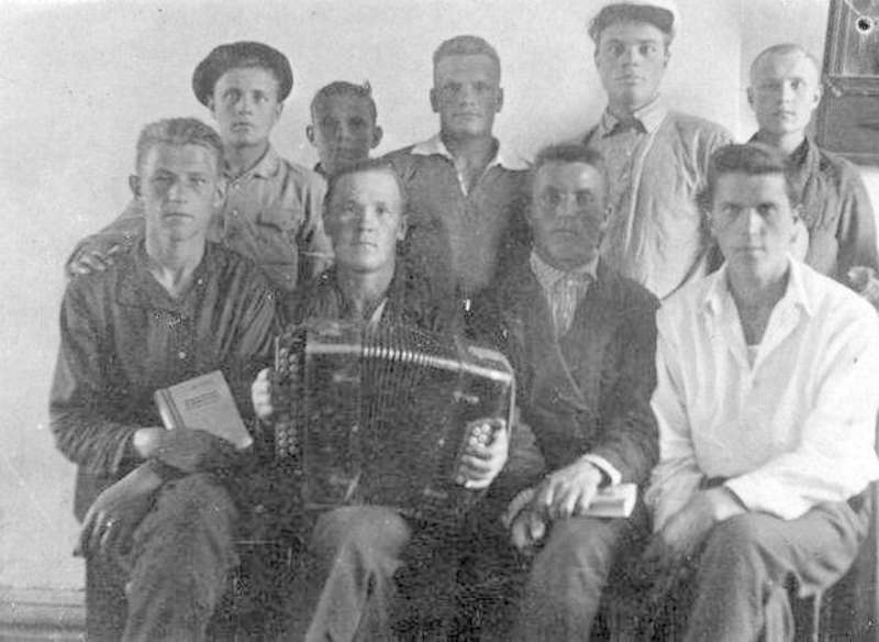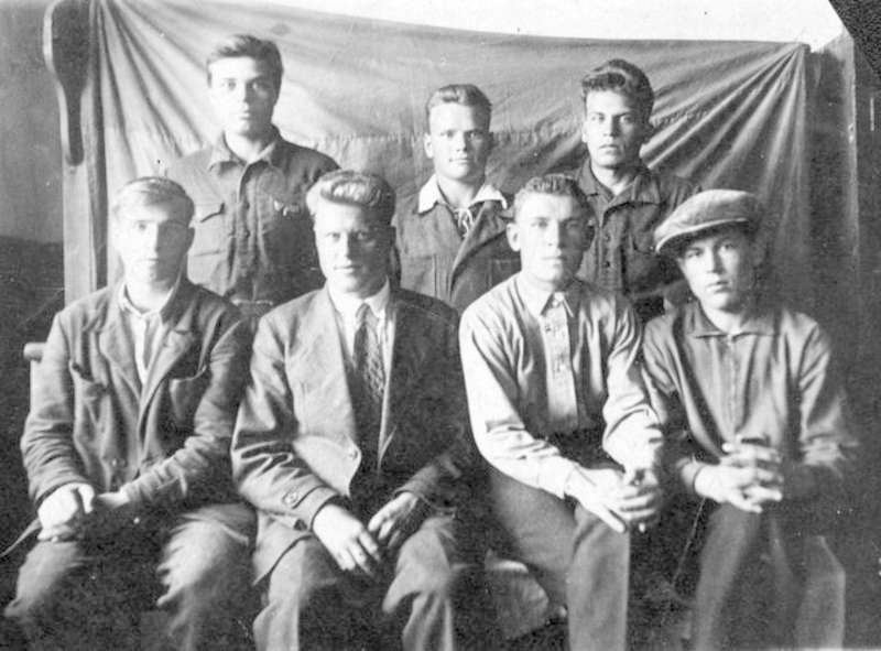 —//— | Учащиеся школы горно-промышленного ученичества Березовского завода. г.Свердловск. 1 ряд (снизу) слева направо: Лысенко, Николаев, Ожгибасов, Устюжанин; 2 ряд: И.Г. Кулемин, Мусихин, Степанцев. Имеется аннотация | ~июль 1935 г. | позитив, фотобумага, удовлетворительное |