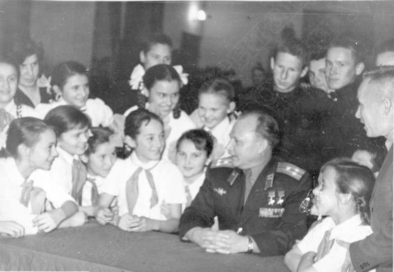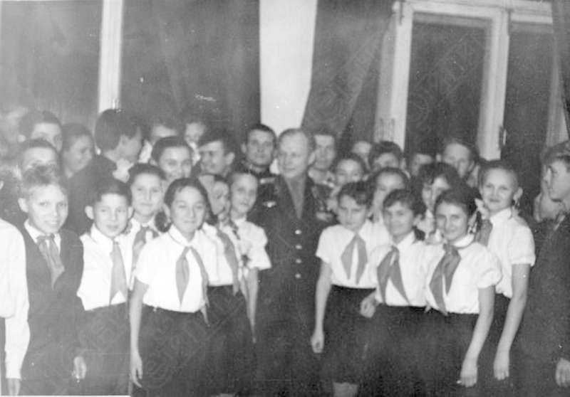 —//— | Кунгурцев Евгений Максимович, полковник, дважды Герой Советского Союза на встрече со школьниками. Снимок 1 | ~1960 г. | позитив, фотобумага, удовлетворительное | |