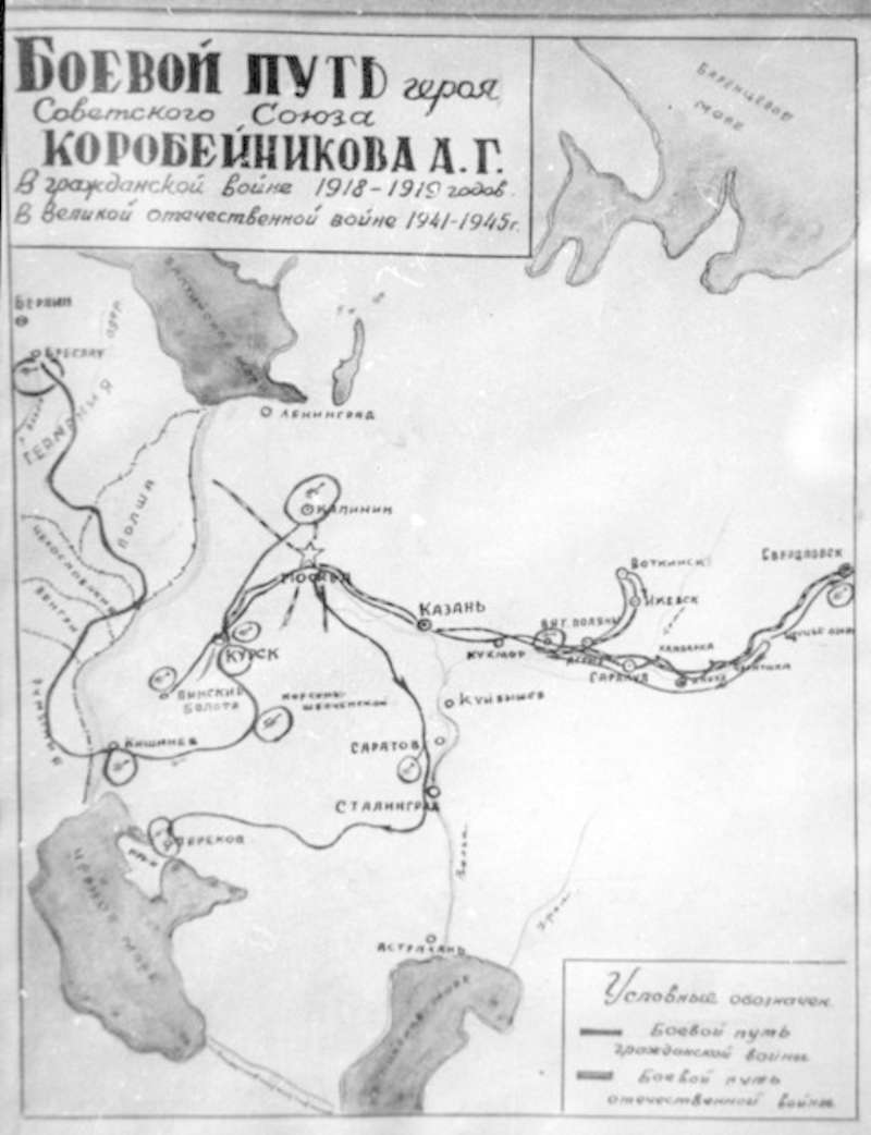 —//— | Карта-схема "Боевой путь Героя Советского Союза Коробейникова А. Г. В гражданской войне 1918-1919 годов. В Великой Отечественной войне 1941-1945 г." Фотокопия | ~1970 г. | позитив, фотобумага, удовлетворительное | |