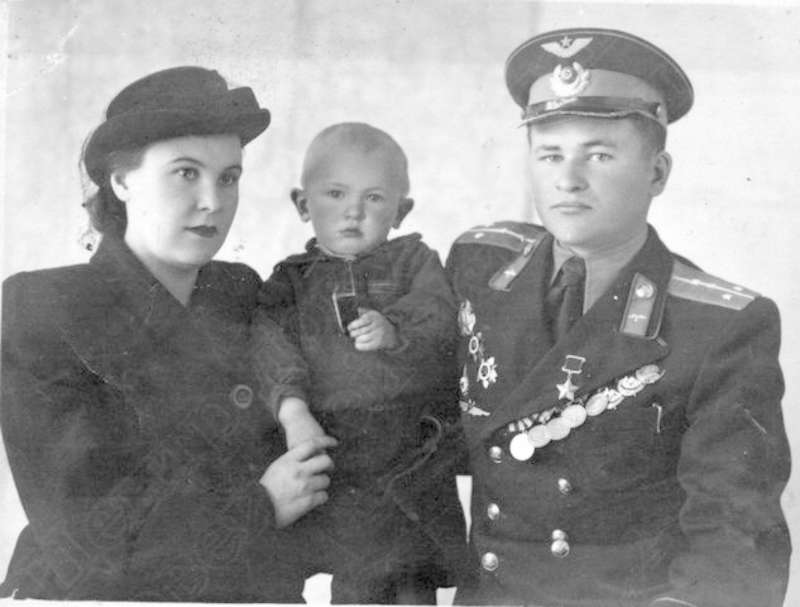 —//— | Клевцов Иван Васильевич, капитан, Герой Советского Союза, кавалер ордена Ленина, 2-х орденов Красного Знамени с женой и ребёнком | ~август 1950 г. | позитив, фотобумага, удовлетворительное | |
