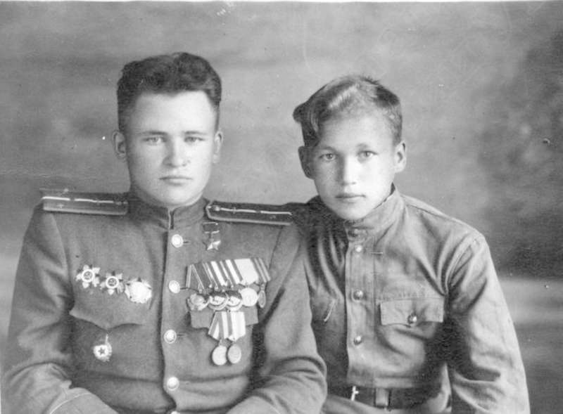 —//— | Клевцов Иван Васильевич (слева), ст. лейтенант, Герой Советского Союза, кавалер ордена Ленина, 2-х орденов Красного Знамени | ~1950 г. | позитив, фотобумага, удовлетворительное | |