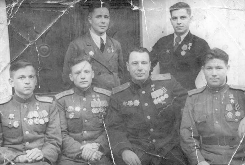—//— | Герои Советского Союза, кавалеры ордена Ленина. 1 ряд (сидят) слева направо: Голдобин Николай Иванович, ст. лейтенант, Герой Советского Союза, кавалер ордена Ленина, Красного Знамени; Кунгурцев Евгений Максимович, капитан, дважды Герой Советского Союза, кавалер ордена Ленина, 3-х орденов Красного Знамени, Красной Звезды; Новиков, Герой Советского Союза, кавалер 2-х орденов Ленина, Красной Звезды; 2 ряд: С.С. Фионин, Герой Советского Союза, кавалер ордена Ленина; Смирнов Борис Александрович, ст. сержант, Герой Советского Союза, кавалер ордена Ленина | ~1948 г. | позитив, фотобумага, удовлетворительное | |