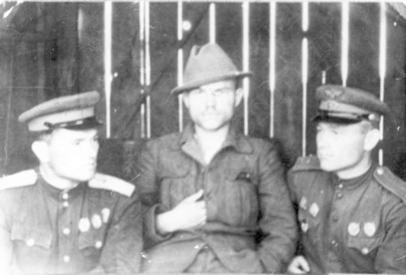—//— | Летчики 91 гвардейского авиационного полка с бойцом партизанского движения. 1-й слева - Николаев Иван Макарович | ~1943 г. | позитив, фотобумага, удовлетворительное |