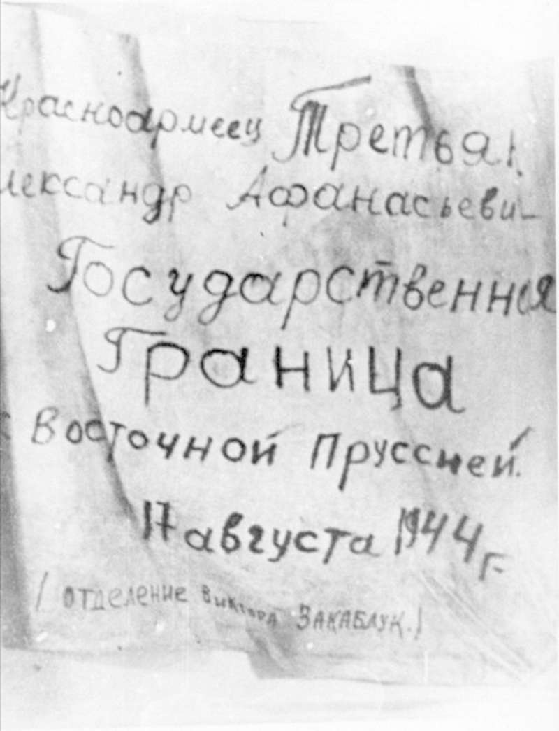 —//— | Красноармеец Третьяк Александр Андреевич. Государственная граница с Восточной Пруссией. 17 августа 1944 г. /отделение Виктора Закавлук./ Фотокопия флага | ~1944 г. | позитив, фотобумага, удовлетворительное | |