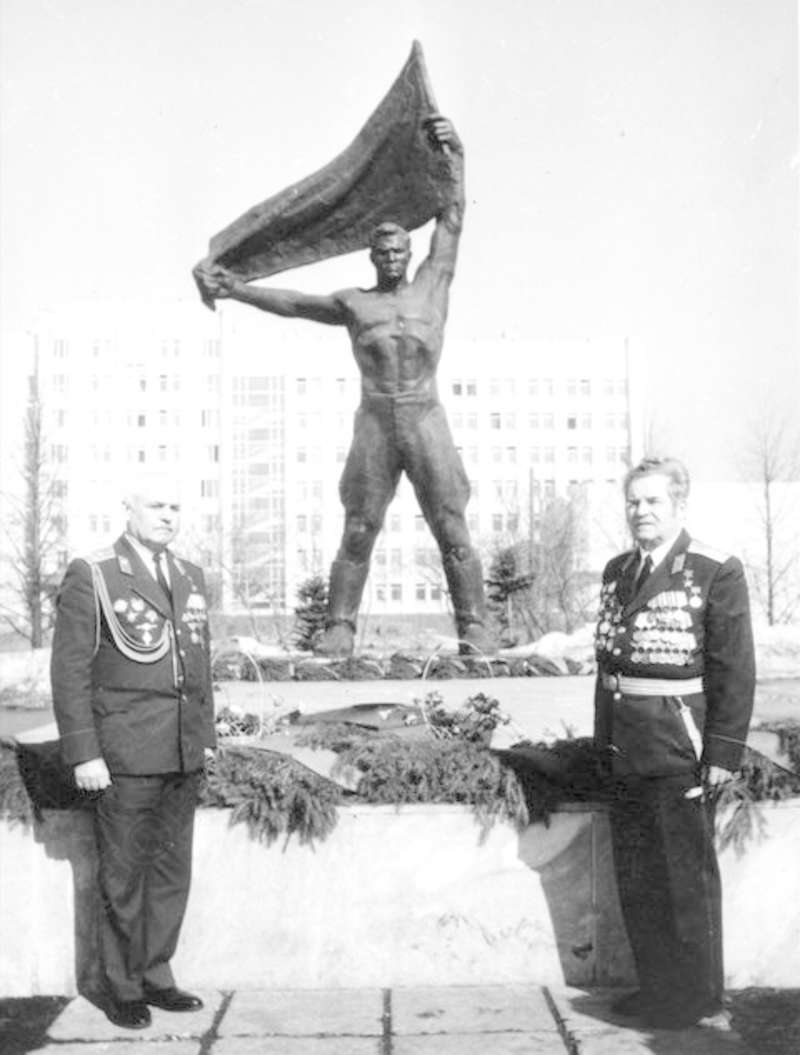 —//— | Ветераны Великой Отечественной войны у монумента боевой и трудовой славы с Вечным огнем. г.Ижевск. Рыков Леонид Васильевич (справа), полковник, Герой Советского Союза, кавалер ордена Ленина, 2-х орденов Красного Знамени, Красной Звезды | ~1983 г. | позитив, фотобумага, удовлетворительное | |