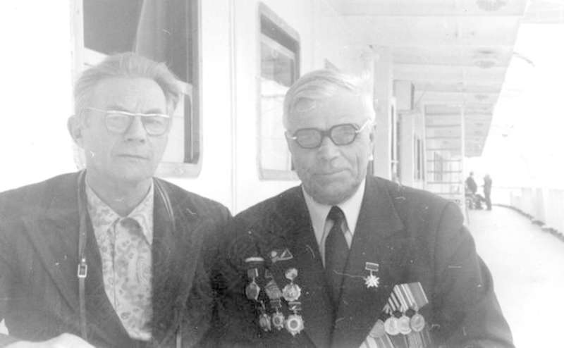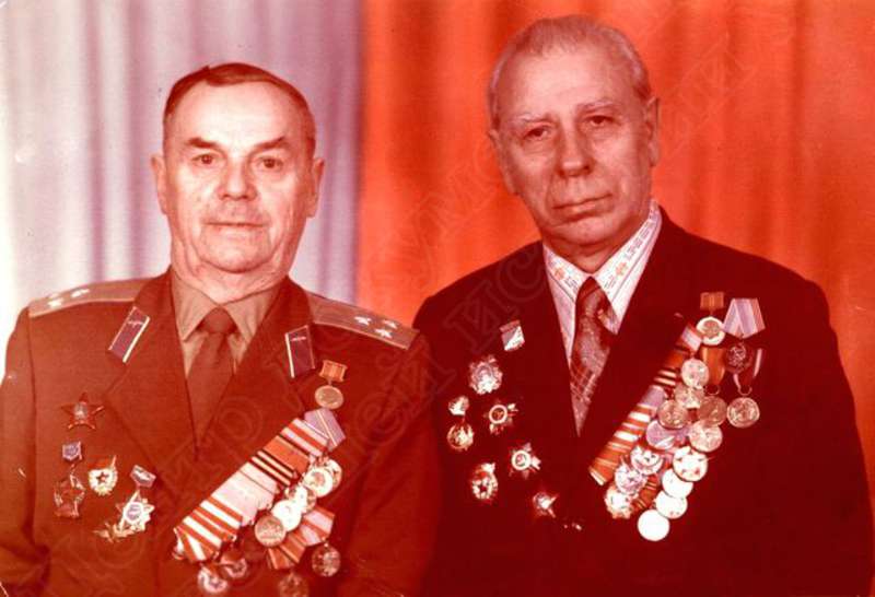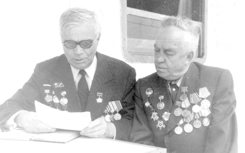 —//— | Встреча ветеранов Великой Отечественной войны. г.Днепропетровск. Портрет. Цикало Андрей Максимович (слева), полковник, ветеран Ижевского аэроклуба, кавалер 2-х орденов Красного Знамени, Красной Звезды; Ивайкин Аким Григорьевич, ветеран Ижевского аэроклуба, кавалер ордена Ленина, Красной Звезды, 2-х орденов Красного Знамени. Имеется дарственная надпись А.М. Цикало И.Г. Кулемину (дата отсутствует) | ~апрель 1980 г. | позитив, фотобумага, удовлетворительное |