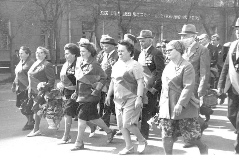 —//— | Шествие ветеранов Великой Отечественной войны к Вечному огню для возложения цветов. г.Ижевск. 1 ряд слева направо: Четкарева Мария Павловна; Балезина Вера Дмитриевна; Брезгина Мария Никифоровна; Рохина Тамара Степановна; Сонина Раиса Михайловна, директор музея Героев Советского Союза школы №73 г.Ижевска; 2 ряд 3-й справа - И.Г. Кулемин | 9 мая 1982 | позитив, фотобумага, удовлетворительное | |
