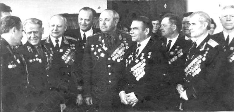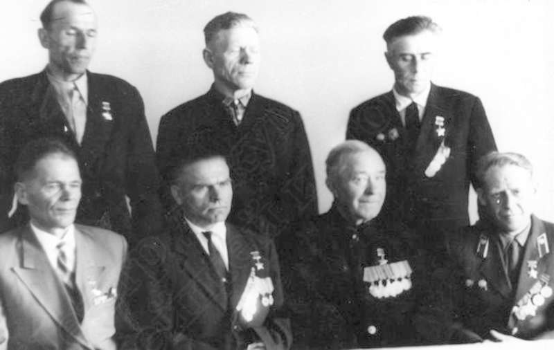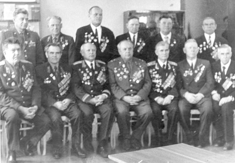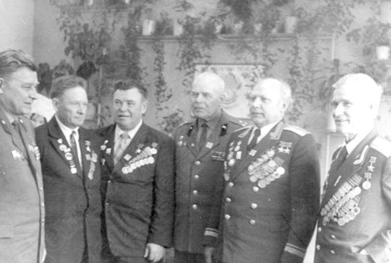 —//— | Встреча ветеранов Великой Отечественной войны. 1 ряд (сидят) слева направо: Ярославцев Александр Егорович, Герой Советского Союза; Юхнин Виктор Михайлович, Герой Советского Союза, кавалер ордена Ленина; Коробейников Афанасий Гурьянович, Герой Советского Союза, кавалер ордена Ленина, ордена Славы 2-й, 3-й ст.; Шамшурин Александр Яковлевич, Герой Советского Союза, кавалер ордена Ленина, Славы 3-й ст., Красной Звезды; 2 ряд: Дербушев Федор Михайлович, Герой Советского Союза; Лушников Александр Матвеевич, Герой Советского Союза; Фионин Сергей Семенович | ~1970 г. | позитив, фотобумага, удовлетворительное | |