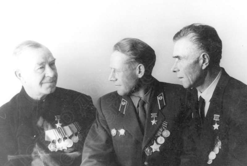 —//— | Встреча ветеранов Великой Отечественной войны. Слева направо: Коробейников Афанасий Гурьянович, Герой Советского Союза, кавалер ордена Ленина, ордена Славы 2-й, 3-й ст.; Шамшурин Александр Яковлевич, Герой Советского Союза, кавалер ордена Ленина, Славы 3-й ст., Красной Звезды; Фионин Сергей Семенович, Герой Советского Союза, кавалер ордена Ленина | ~1970 г. | позитив, фотобумага, удовлетворительное | |
