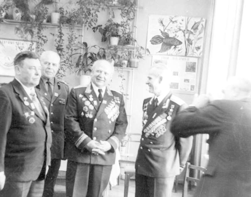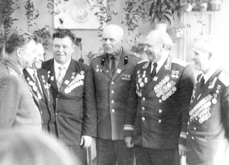 —//— | Встреча ветеранов Великой Отечественной войны. 3-й слева - Кунгурцев Евгений Максимович, генерал-майор, дважды Герой Советского Союза, кавалер ордена Ленина, 3-х орденов Красного Знамени; 5-й - Томиловский Георгий Сергеевич, полковник, Герой Советского Союза; 2-й справа - Опалев Владимир Никифорович, полковник, Герой Советского Союза, кавалер 2-х орденов Ленина, 2-х орденов Красного Знамени, 2-х орденов Красной Звезды | ~1970 г. | позитив, фотобумага, удовлетворительное | |