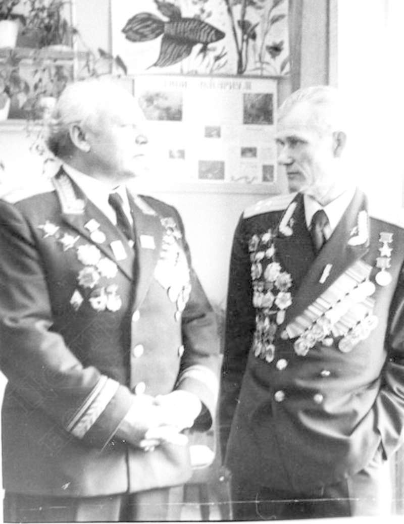 —//— | Встреча ветеранов Великой Отечественной войны. Слева направо: Кунгурцев Евгений Максимович, генерал-майор, дважды Герой Советского Союза, кавалер ордена Ленина, 3-х орденов Красного Знамени; Опалев Владимир Никифорович, полковник, Герой Советского Союза, кавалер 2-х орденов Ленина, 2-х орденов Красного Знамени, 2-х орденов Красной Звезды | ~1970 г. | позитив, фотобумага, удовлетворительное | |