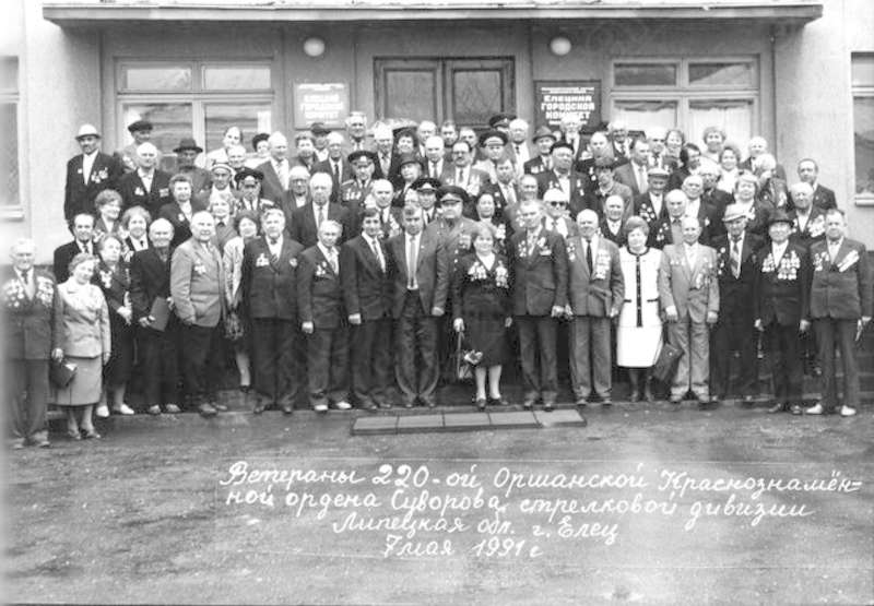 —//— | Ветераны 220-й Оршанской стрелковой дивизии у здания Елецкого горкома КПСС. 1 ряд (снизу): 3-й слева - Шилов; 9-й справа - В.Г. Сошнев, генерал-майор, председатель Совета ветеранов дивизии; верхний ряд: слева от дверей - Н.В. Ольховский | 7 мая 1991 | позитив, фотобумага, удовлетворительное | |