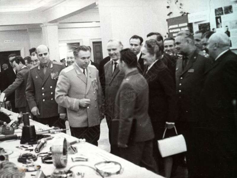 —//— Делегация во главе с министром внутренних дел СССР Николаем Анисимовичем Щёлоковым (в центре) осматривает [выставку промышленных изделий] в г. Ижевске. Справа: 1-й - Марисов Валерий Константинович, первый секретарь Удмуртского обкома КПСС, 2-я - Максимова Анна Георгиевна, секретарь Удмуртского обкома КПСС. Название выставки не указано ~1967 г. позитив, фотобумага, удовлетворительное Делегация во главе с  министром внутренних дел СССР Николаем Анисимовичем Щёлоковым (в центре) осматривает [выставку промышленных изделий] в г. Ижевске. Справа: 1-й - Марисов Валерий Константинович, первый секретарь Удмуртского обкома КПСС, 2-я - Максимова Анна Георгиевна, секретарь Удмуртского обкома КПСС.  Название выставки не указано