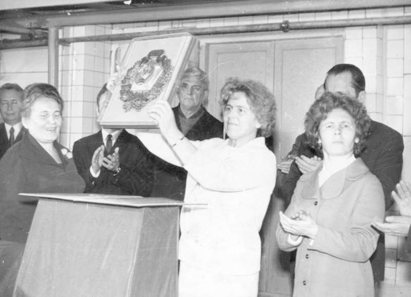 —//— [Церемония вручения подарка с изображением герба СССР]. 2-я слева - Максимова Анна Георгиевна. Название мероприятия не указано ~1970 г. позитив, фотобумага, удовлетворительное [Церемония вручения подарка с изображением герба СССР]. 2-я слева - Максимова Анна Георгиевна.  Название мероприятия не указано