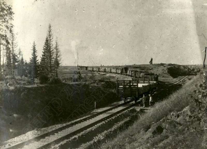 —//— | Альбом строительства железнодорожной линии Ижевск- Балезино. Грузовой поезд с дровами для Ижевских заводов на 87 км. Справа - выемка незаконченного южного участка основного Кекоранского хода | ~1943 г. | позитив, фотобумага, удовлетворительное | |