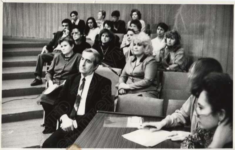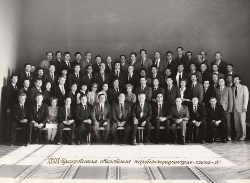 —//— Участники научно-практической конференции, посвященной 70-летию создания Удмуртской республиканской партийной организации. 6-й слева - руководитель Общественно-политического и учебного центра Удмуртского рескома КП РСФСР Юрий Иванович Копысов. г. Глазов. 23 мая 1991 позитив, фотобумага, удовлетворительное Участники научно-практической конференции, посвященной 70-летию создания Удмуртской республиканской партийной организации. 6-й слева - руководитель Общественно-политического и учебного центра Удмуртского рескома КП РСФСР Юрий Иванович Копысов. г. Глазов.