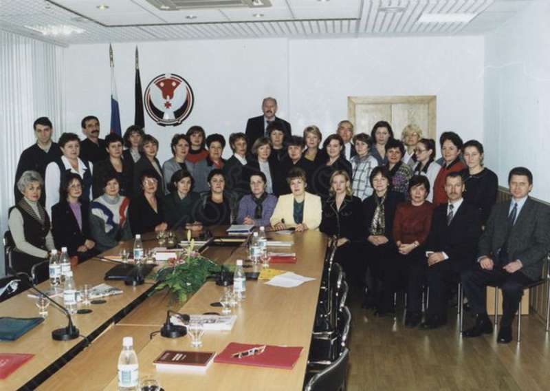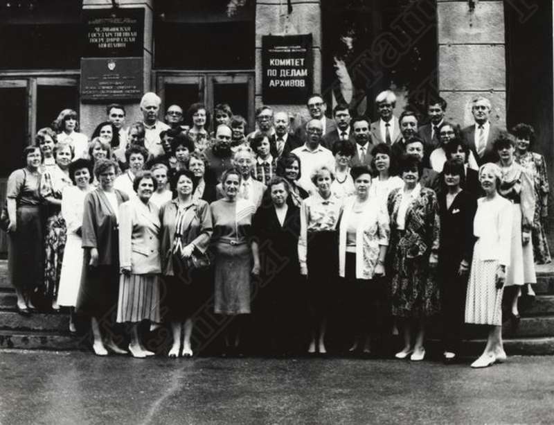 —//— Участники курсов повышения квалификации заведующих архивными отделами исполкомов городских и районных Советов народных депутатов УР у здания Правительства УР. 1-й ряд снизу: слева направо - заместитель председателя Комитета по делам архивов при Правительстве УР Юрий Иванович Копысов, председатель Комитета по делам архивов при Правительстве УР Надежда Кузьминична Коробейникова, заместитель председателя Комитета по делам архивов при Правительстве УР Владимир Николаевич Бобков. ~ноябрь 1995 г. позитив, фотобумага, удовлетворительное Участники курсов повышения квалификации заведующих архивными отделами исполкомов городских и районных Советов народных депутатов УР у здания Правительства УР. 1-й ряд снизу: слева направо - заместитель председателя Комитета по делам архивов при Правительстве УР Юрий Иванович Копысов, председатель Комитета по делам архивов при Правительстве УР Надежда Кузьминична Коробейникова, заместитель председателя Комитета по делам архивов при Правительстве УР Владимир Николаевич Бобков.